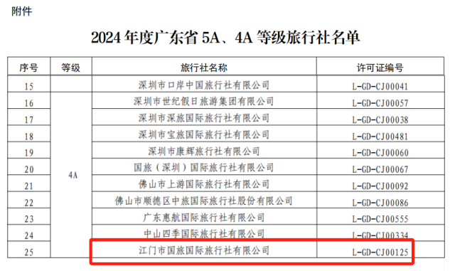 去年7月,广东省文化和旅游厅正式开展2024年度全省A级旅行社评定工作,市文广旅体局根据有关通知要求组织符合条件的旅行社进行申报工作,并于去年12月评选江门市教育旅行社等3家旅行社为广东省3A级旅行社。通过此次评选后,我市共有1家广东省5A级旅行社、3家4A级旅行社、14家3A级旅行社。