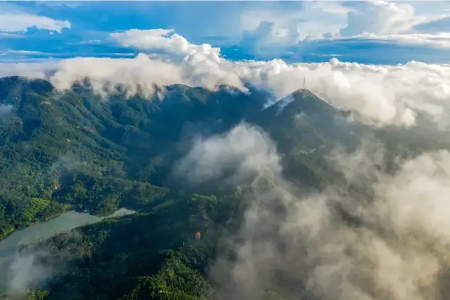 圭峰山国家森林公园,位于江门市新会区,森林覆盖率达98%。山上常年水汽蒸腾,云雾缭绕,形成“云峰烟雨”“东岭晨曦”等自然景观,夹带着高山密林湖泊的清新空气,宛如人间仙境。圭峰以“绿”闻名,“圭峰叠翠”现为新会八景之首。