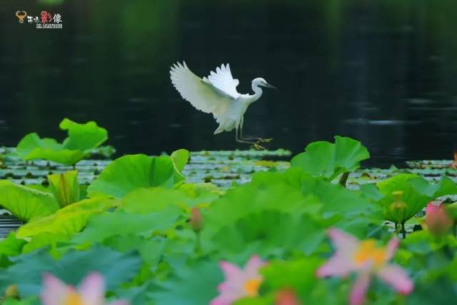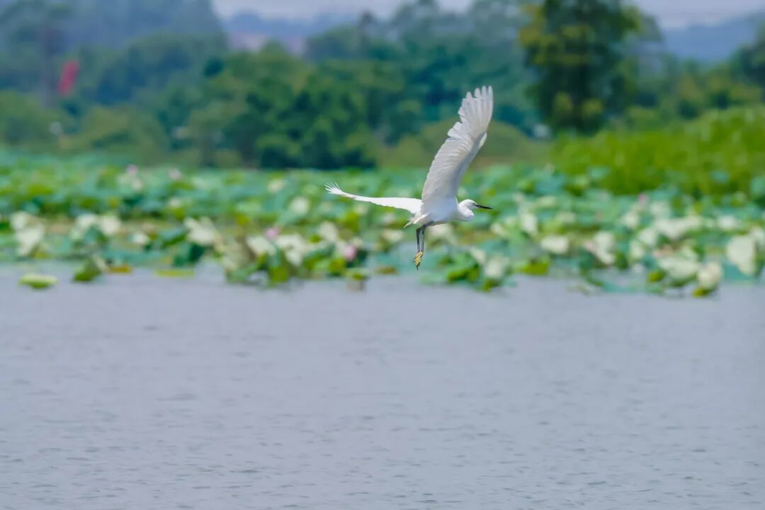 几只白鹭从荷塘上空掠过,