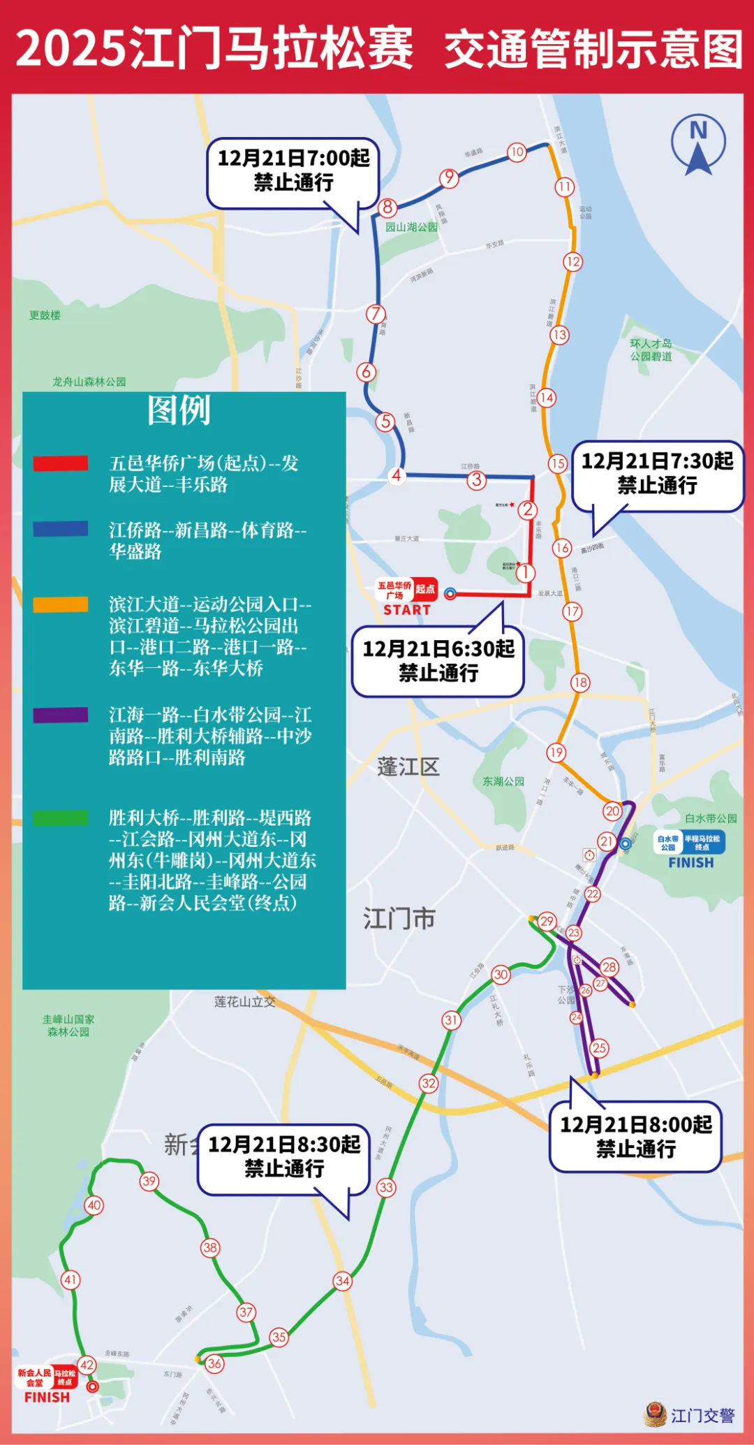 2025江门马拉松赛定于12月21日(星期日)7时30分在江门蓬江区、江海区、新会区举行。比赛起点设在五邑华侨广场,半程马拉松终点设在江海一路(白水带体育公园)、全程马拉松终点设在新会人民会堂。为保障赛事安全、顺利进行,根据《中华人民共和国道路交通安全法》有关规定,赛事周期将对部分道路分时、分段采取交通管制措施。现将有关事项通告如下: