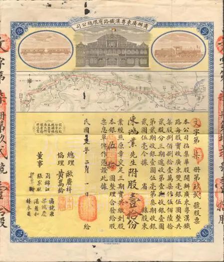 1918年商办广东粤汉铁路有限总公司发给陈鸿业的股票凭证(江门市博物馆馆藏)
