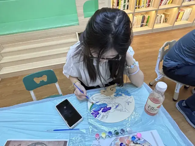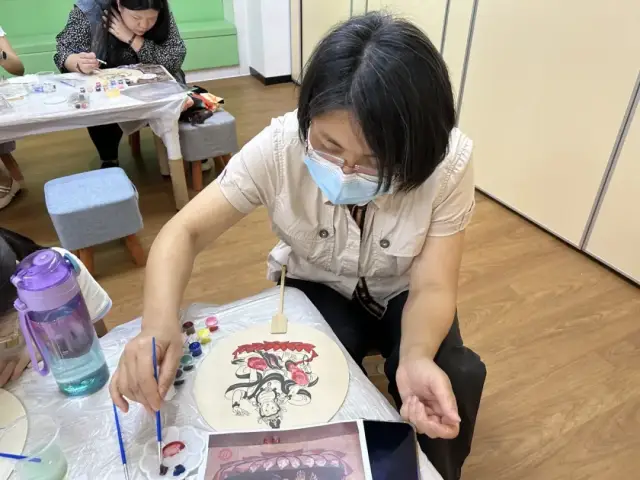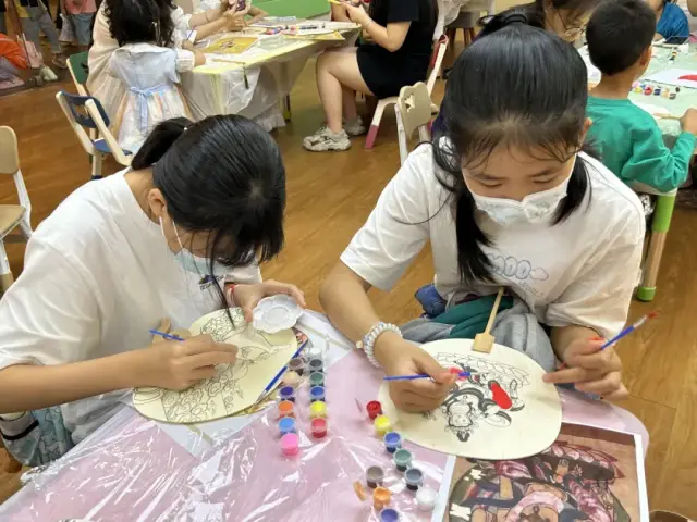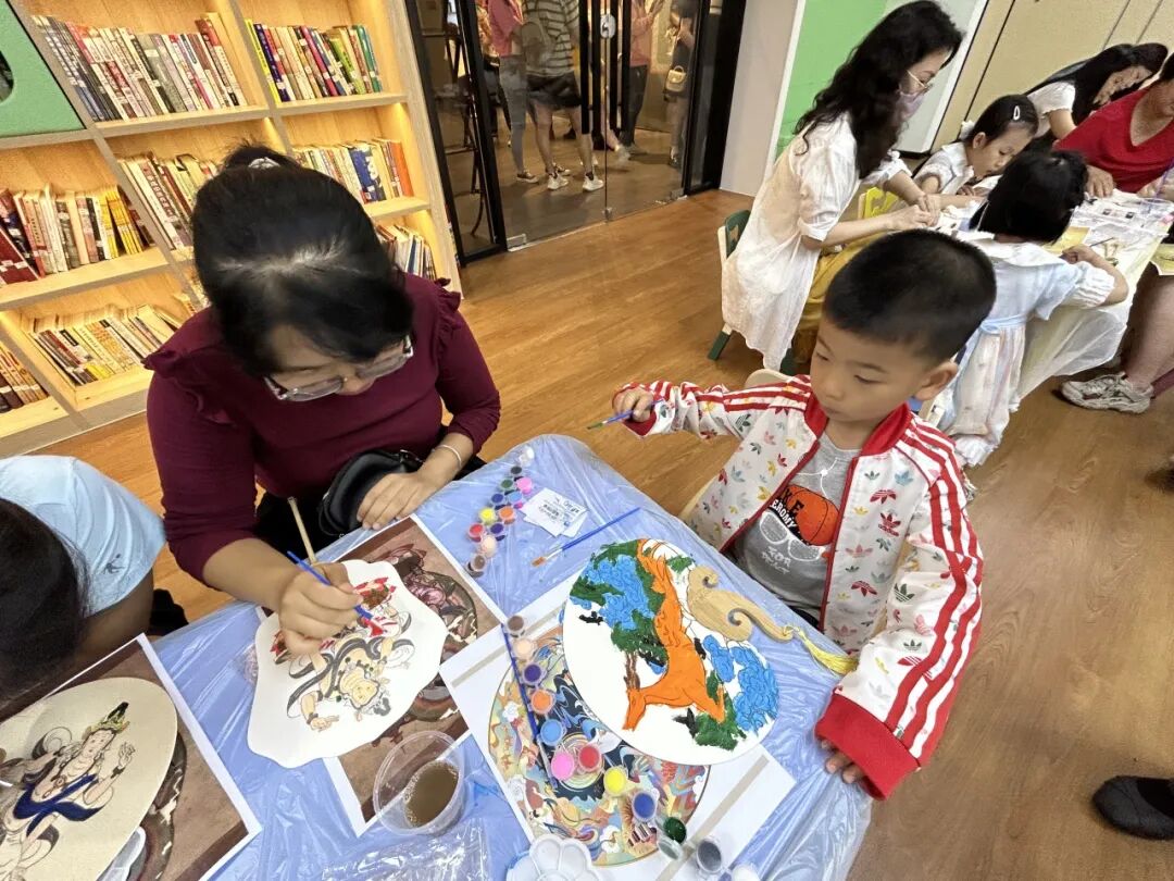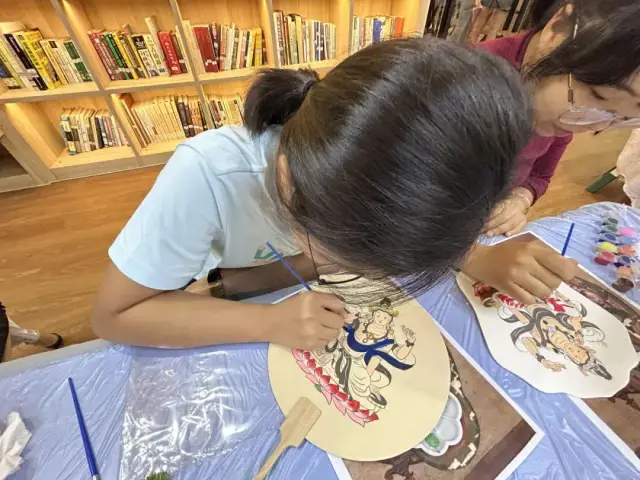 初步学习与鉴赏团扇后,观众开始动手制作自己的敦煌团扇,在轻柔的敦煌音乐中,拿起画笔在扇子上填充颜色,在绘画过程中发挥自己的奇思妙想,一个个素白的扇面被点缀成灵动多彩、独一无二的精美作品。