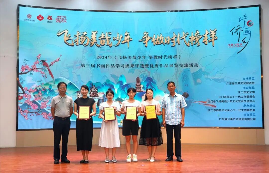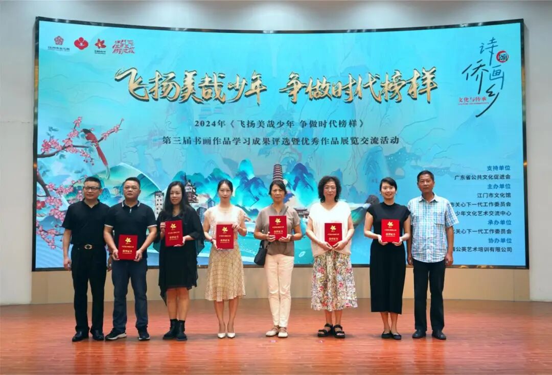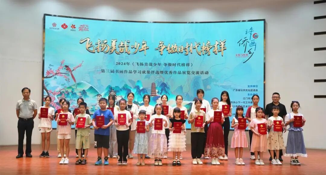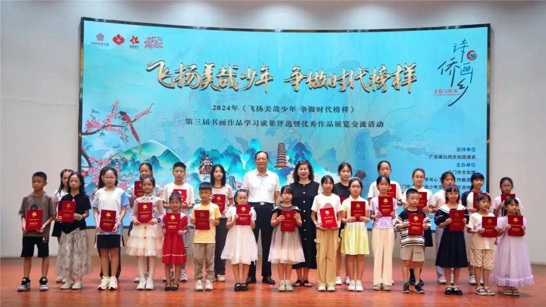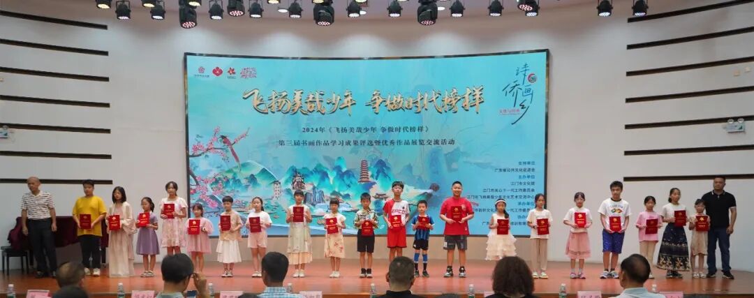 7月17日,由广东省公共文化促进会支持,江门市文化馆、江门市关心下一代工作委员会、江门市飞扬美哉少年文化艺术交流中心主办,江门市韵轩文化关心下一代工作委员会承办,广东蒲公英艺术培训有限公司协办的诗画颂侨乡•文化与传承——2024年“飞扬美哉少年 争做时代榜样”第三届书画作品学习成果评选颁奖典礼暨优秀作品展览开幕仪式在江门市文化馆二楼多功能厅举办。来自广东省公共文化促进会、江门市关工委、江门市文化馆、江门市蓬江区关工委等相关单位的领导嘉宾、领奖师生代表出席了活动。