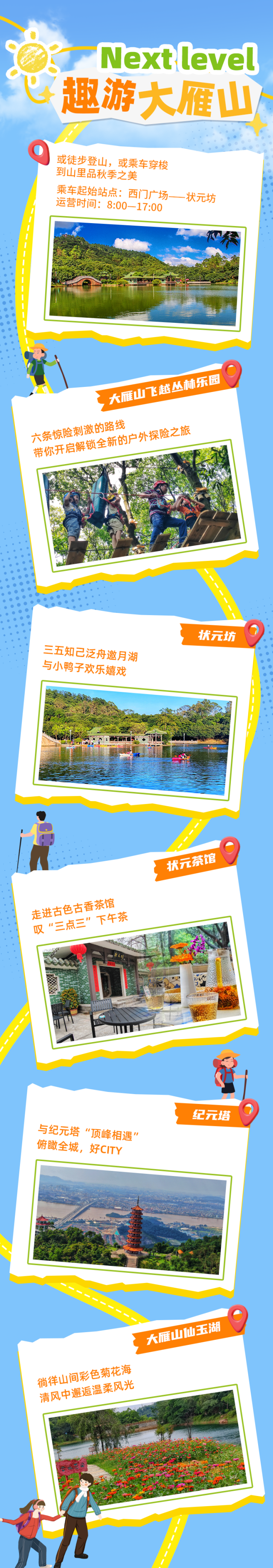 登高揽胜路线:西门广场——雁鸣谷——山言茶语——雁鸣池——雀花廊——烧烤村——纪元塔