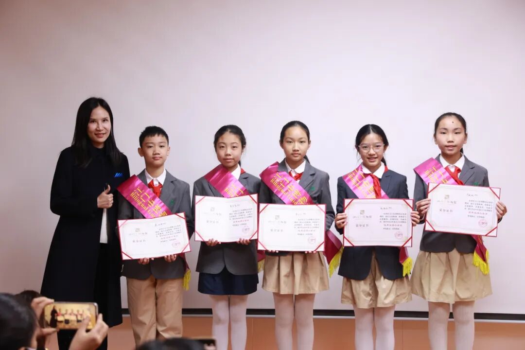 会议表彰了36名优秀成人志愿者、5名双语小导赏优秀指导教师、15名优秀双语小导赏,其中熊芷晴、莫子恒、任芷悠3名同学被评为五星优秀双语小导赏。