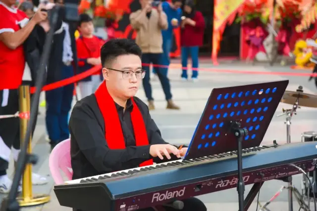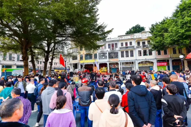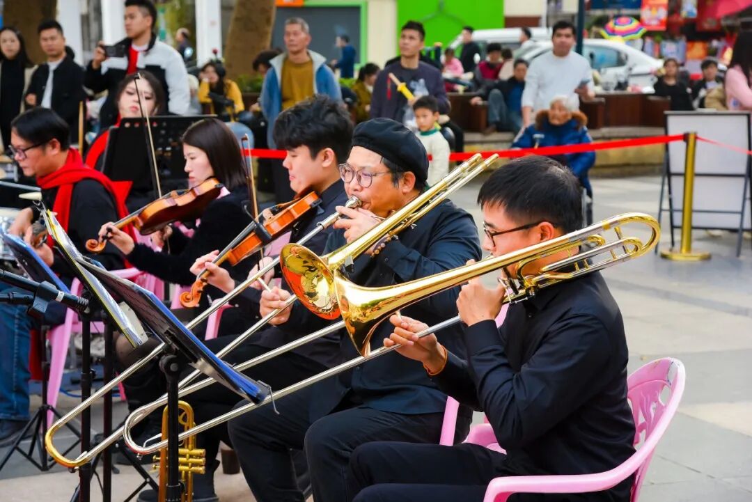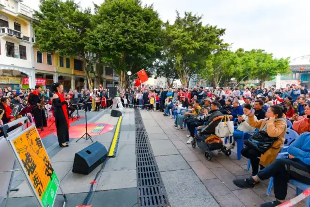 冬日暖阳照耀着骑楼古街,空气中弥漫着节日的欢乐,广场的喧嚣与悠扬的音符交织成一幅动人的画卷。