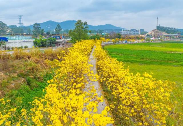 村中的黄花风铃木花开正盛,