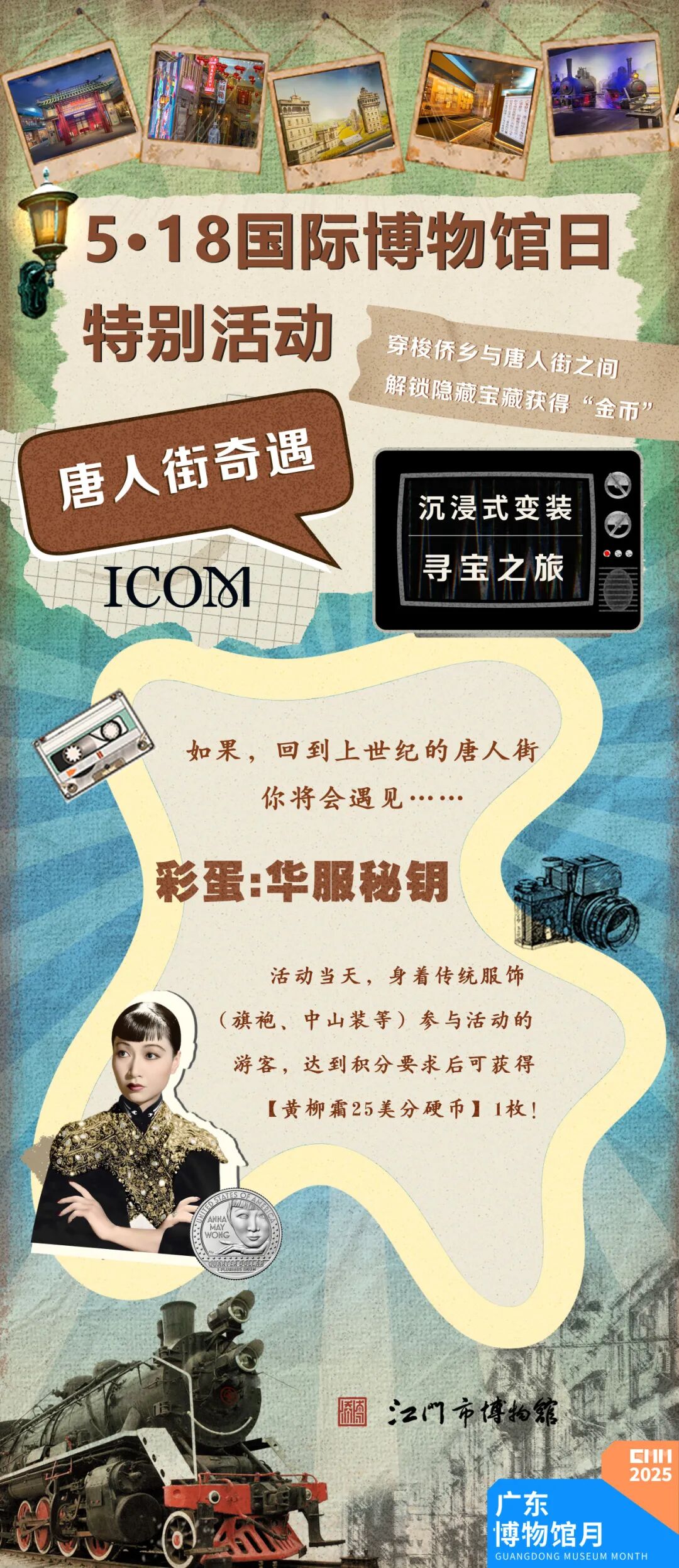 5月18日下午3点,侨博馆唐人街展区内唐人街奇遇·沉浸式变装寻宝之旅将会上线,活动通过角色扮演、实景解谜、知识问答、合作挑战等形式,将会带领参与者沉浸式体验华侨奋斗历程。完成十大任务后,根据积分兑换精美文创纪念品。小编悄悄透露,听说参与活动还有机会获得酒店客房体验券、茶楼的点心券、黄柳霜人像25美分纪念币哦!后续报名将会在“江门市博物馆”微信公众号推出哦!