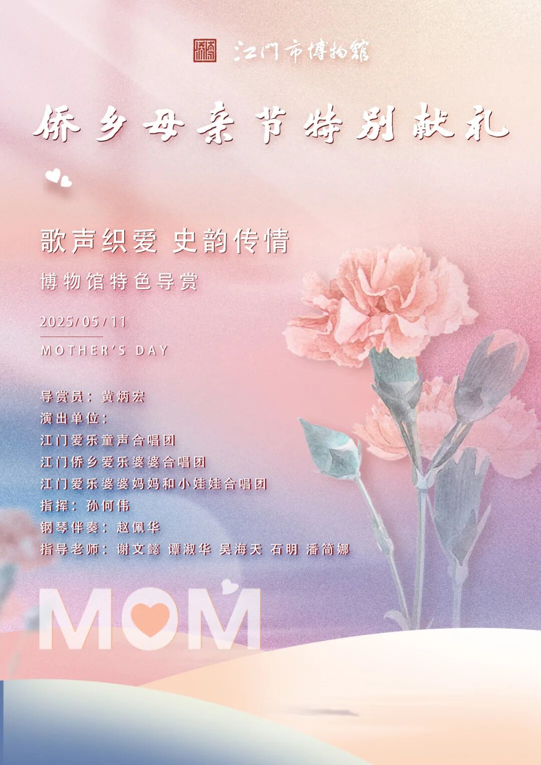 5月11日14时30分,在侨博馆新馆举办“侨乡母亲节特别献礼:歌声织爱 史韵传情——博物馆特色导赏活动”,活动以讲解导览+音乐演唱的形式,为观众带来创新的观展模式。活动邀请江门爱乐童声合唱团、江门侨乡爱乐婆婆合唱团、江门爱乐婆婆妈妈和小娃娃合唱团参与演出,将演唱《东方之珠》粤语版、《萱草花》、《我和我的祖国》、《故乡的云》等10余首歌曲。后续报名将会在“江门市博物馆”微信公众号推出哦!