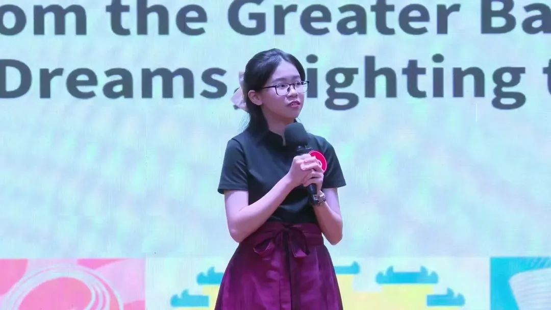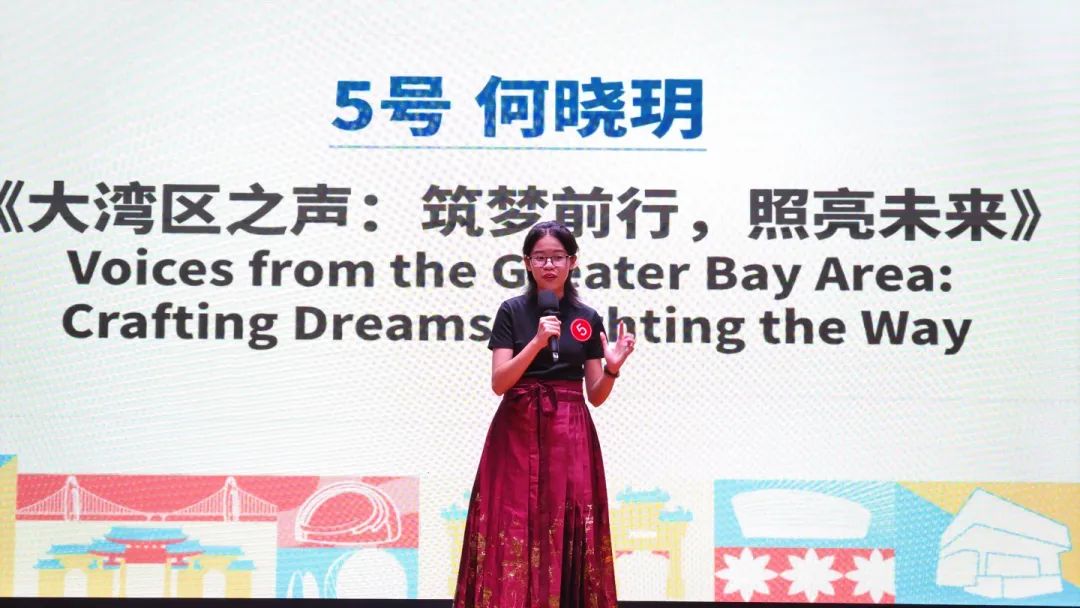 本次线下风采展示活动包含定题演讲和现场问答两个环节。在众多高校学生和英语教师中,来自江门市第一中学景贤学校的何晓玥同学展现出不输成人的光芒。“莫道少年郎,志气平地起;心似磐石坚,才华耀四方。”在演讲环节,她以《大湾区之声:筑梦前行,照亮未来》(Voices from the Greater Bay Area: Crafting Dreams, Lighting the Way)为题,英文语音语调自然动听、口语表达清晰流畅、语言措辞生动细腻,将自我成长与湾区建设相融合,诉说对大湾区的深情厚谊;在问答环节,她反应机敏,迅速组织语言,调动知识库,全面展示语言功底及文化储备。最终她以新颖的主题演讲内容、稳健的台风和机敏的临场反应,征服了现场评委和观众,斩获“语言之星”奖项。