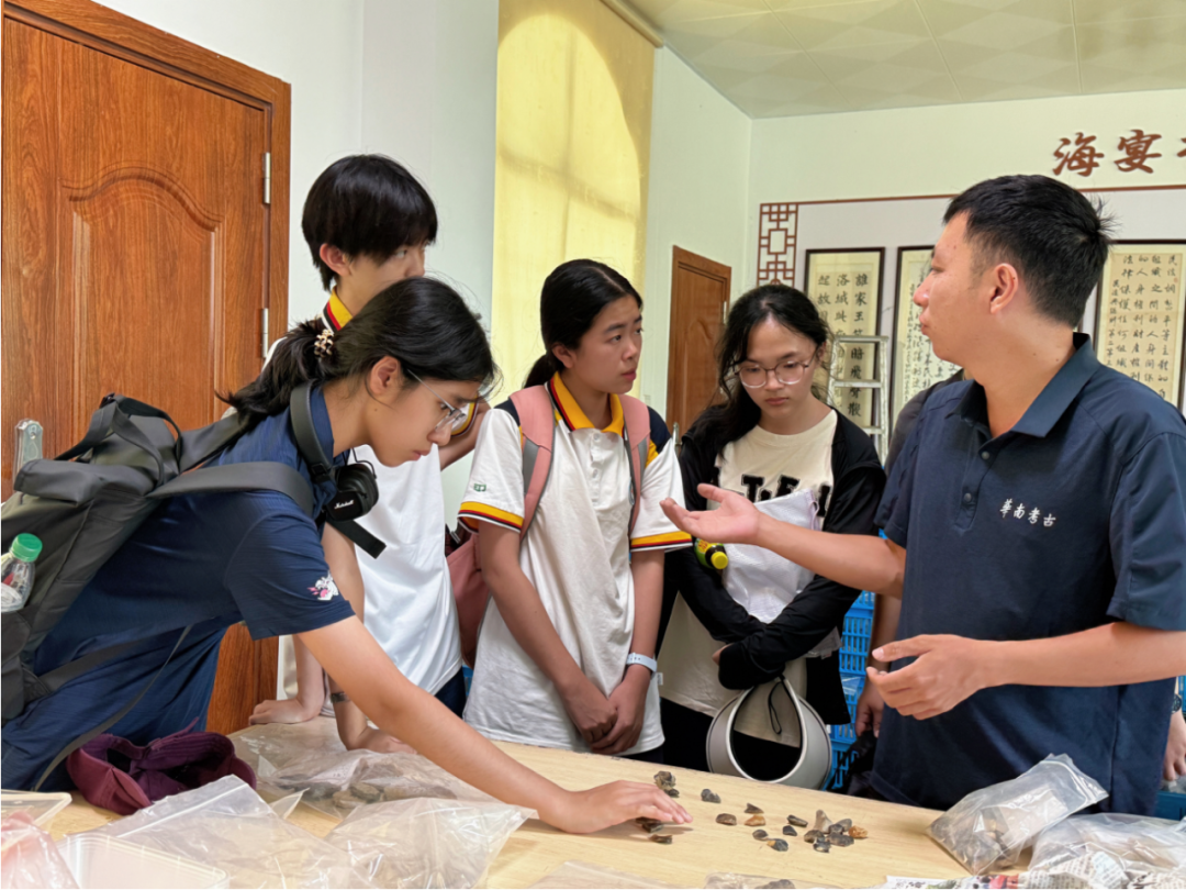 随后,同学们进库房参观,见识了不同历史时期的器物的纹饰、材质、用途等信息,也了解了考古工作者在库房中进行的初步的器物拼对、修复与拓片制作。江门市培英高级中学赵梓谦同学参观后感慨,“原以为考古发现的都是完整的文物,没先到大部分都是碎片。老师展示修复后的陶罐,光是拼合碎片就花了两个月!考古背后是常人难以想象的细致工作。”