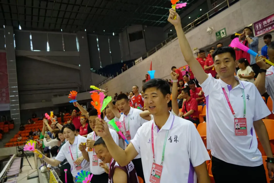 △吉林省代表队成员为赛场上的运动健儿加油助威。