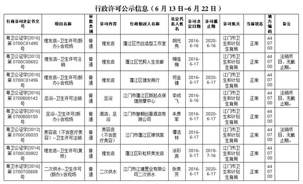 行政许可公示信息(6月13日-6月22日)