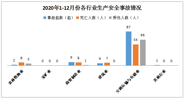 1-12月,全市共发生生产安全事故105起,其中农林牧渔业2起,商贸制造业9起,建筑业6起,交通运输和仓储业87起,其他行业1起