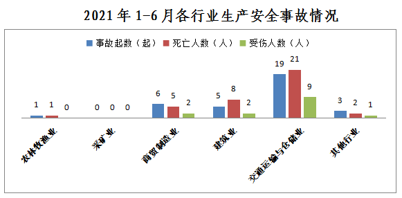 1-6月,全市共发生生产安全事故34起,其中农林牧渔业1起、占3%;商贸制造业6起、占17%;建筑业5起、占15%;交通运输和仓储业19起、占56%;其他行业3起、占9%。