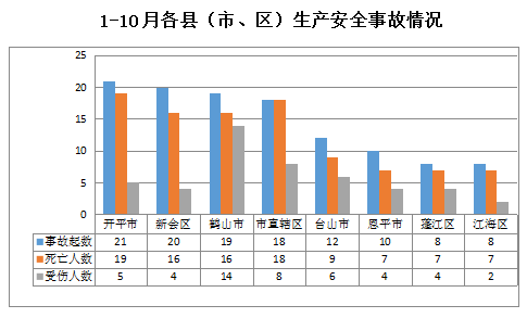 1-10月,开平市发生交通运输和仓储业事故21起;新会区发生交通运输和仓储业事故20起;鹤山市发生事故19起(其中商贸制造业事故1起、交通运输和仓储业事故18起);市直辖区发生事故18起(其中道路运输事故15起、水上运输事故3起);台山市发生事故12起(其中商贸制造业事故1起、交通运输和仓储业事故11起);恩平市发生交通运输和仓储业事故10起;蓬江区发生交通运输和仓储业事故8起;江海区发生交通运输和仓储业事故8起。