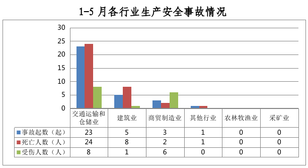 全市共发生生产安全事故32起,其中交通运输和仓储业23起、占72%,建筑业5起、占15%,商贸制造业3起、占10%,其他行业1起、占3%。农林牧渔业和采矿业未发生生产安全事故。