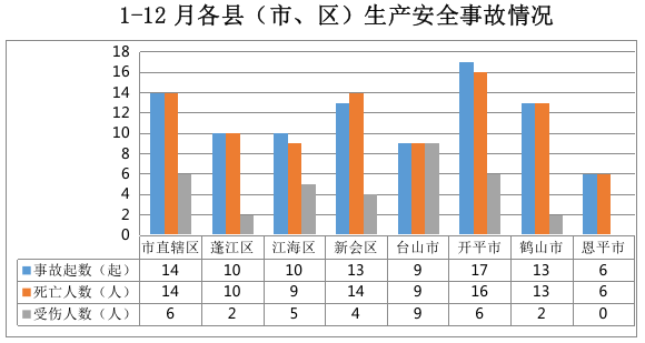 市直辖区事故14起,蓬江事故10起,江海事故10起,新会事故13起,台山事故9起,开平事故17起,鹤山事故13起,恩平事故6起。