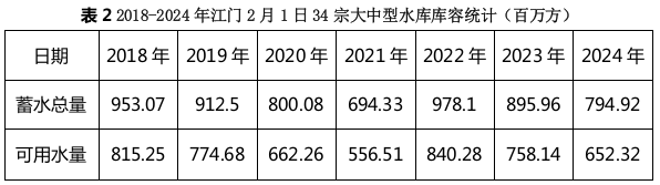 (三)水情:1月份西江来水平均流量2620m3/s,比常年少5%。2月1日,34宗大中型水库蓄水总量794.92百万方,较常年同期少5%,蓄水总量占总正常库容比例为61%,可用水量652.32百万方,占总兴利库容比例为56%;21宗供水水库蓄水总量625.4百万方,较常年同期多27.38百万方,可用水量503.86百万方,占兴利库容比例64%。