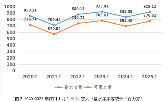 (三)水情:2024年12月份月平均流量2400m3/s,较常年同期少18%。2025年1月1日,34宗大中型水库蓄水总量919.11百万方,较常年同期多7%,蓄水总量占总正常库容比例为70%,可用水量776.51百万方,占总兴利库容比例为67%;21宗供水水库蓄水总量659.35百万方,较常年同期多8%,可用水量537.81百万方,占兴利库容比例68%。