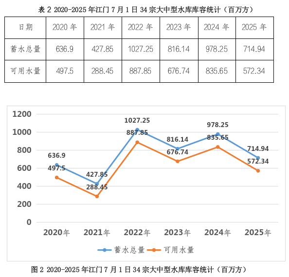 (三)水情:6月份西江干流水道马口水文站月平均流量14900立方米每秒,较常年同期多1%。2025年7月1日,34宗大中型水库蓄水总量714.94百万方,较常年同期少17%,蓄水总量占总正常库容比例为55%,可用水量572.34百万方,占总兴利库容比例为49%;21宗供水水库蓄水总量523.52百万方,较常年同期少15%,可用水量401.98百万方,占兴利库容比例51%。