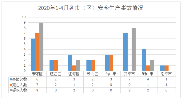 1-4月,市辖区发生交通运输和仓储业事故6起(其中道路运输事故5起、水上运输事故1起);蓬江区发生道路运输事故2起;江海区发生道路运输事故3起;新会区发生事故2起(其中道路运输事故1起、其他行业事故1起);台山市发生事故3起(其中道路运输事故2起、商贸制造业1起);开平市发生道路运输事故7起;鹤山市共发生事故4起(其中道路运输事故3起、其他行业事故1起);恩平市发生商贸制造业事故1起。