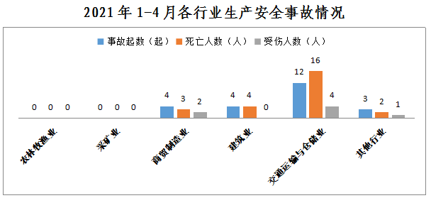 1-4月,全市共发生生产安全事故23起,其中商贸制造业4起、占17%;建筑业4起、占17%;交通运输和仓储业12起、占53%;其他行业3起、占13%。