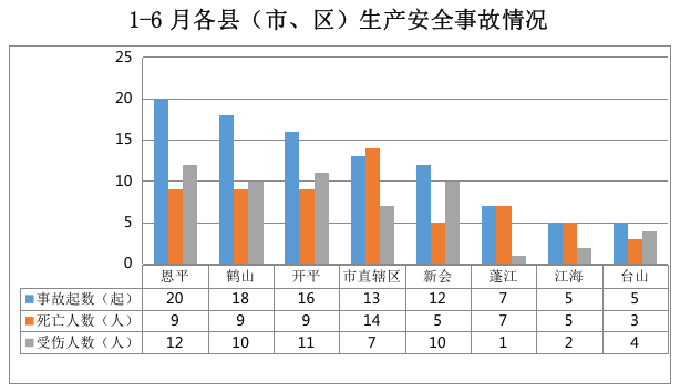 全市发生生产安全事故96起:恩平市20起,鹤山市18起,开平市16起,市直辖区13起,新会区12起,蓬江区7起,江海区5起,台山市5起。