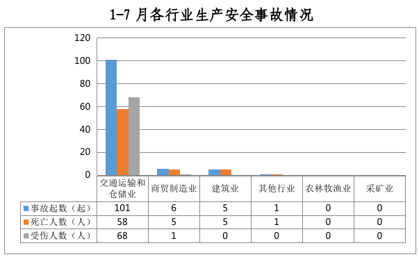 全市共发生生产安全事故113起,其中交通运输和仓储业101起、占90%,商贸制造业6起、占5%,建筑业5起、占4%,其他行业1起、占1%。农林牧渔业和采矿业未发生生产安全事故。