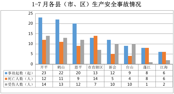 全市发生生产安全事故113起:开平23起, 鹤山22起,恩平20起,市直辖区13起,新会12起,台山9起,蓬江8起,江海6起。
