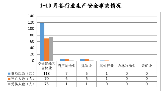 全市共发生生产安全事故132起,其中交通运输和仓储业118起、占89%,商贸制造业7起、占6%,建筑业6起、占4%,其他行业1起、占1%。农林牧渔业和采矿业未发生生产安全事故。