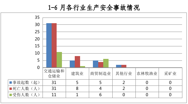 全市共发生生产安全事故43起,其中交通运输和仓储业31起、占72%,建筑业5起、占11.5%,商贸制造业5起、占11.5%,其他行业2起、占5%。农林牧渔业和采矿业未发生生产安全事故。