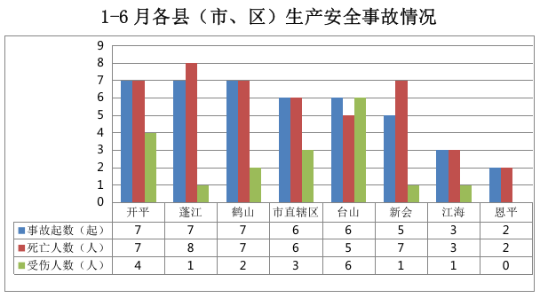 开平事故7起,蓬江事故7起,鹤山事故7起,市直辖区事故6起,台山事故6起,新会事故5起,江海事故3起,恩平事故2起。