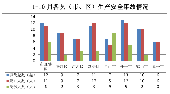市直辖区事故12起,蓬江事故9起,江海事故7起,新会事故11起,台山事故7起,开平事故13起,鹤山事故10起,恩平事故6起。