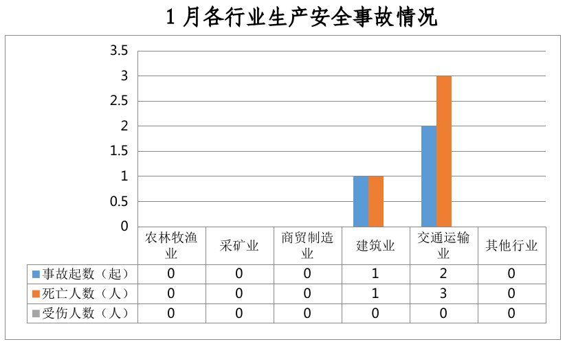 全市共发生生产安全事故3起,其中交通运输和仓储业2起、占67%,建筑业1起、占33%。农林牧渔业、采矿业、商贸制造业和其他行业未发生生产安全事故。
