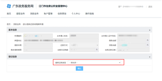 (2) 在登记信息界面选择提前还款类型(缩期、缩额、缩期又缩额),录入完缩期后借款期数(不含当期)、提前还款金额等信息后,鼠标点击空白处或者按enter键,系统自动计算提前还款后首月还款额、缩期后合同到期日,点击“确认”按钮完成业务。