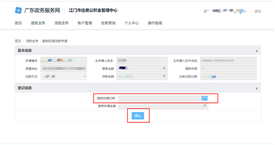(2)在登记信息界面选择提前结清日期后,鼠标点击空白处或者按enter键,系统自动计算提前结清金额,点击“确认”按钮完成业务。