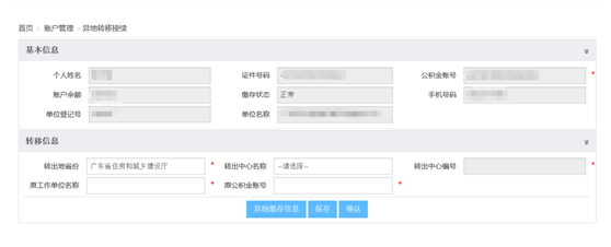 (2)下拉选择转出地省份、转出中心名称,填写原工作单位名称、原公积金账号,点击“保存”按钮,保存信息,点击确认。