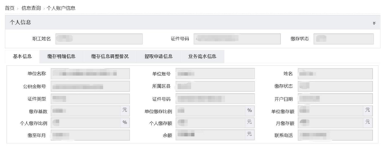 基本信息、缴存明细信息、缴存信息调整情况、提取申请信息、业务流水信息。