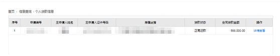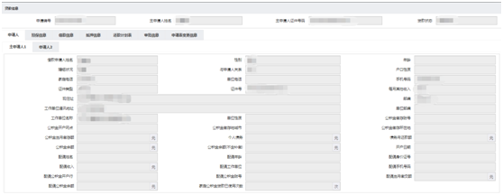 (3) 选择贷款记录的”“详情查看”按钮可以进入贷款基本信息查看界面,查看申请人信息、担保信息、借款信息、抵押信息、还款计划表、审批信息、申请表变更信息。
