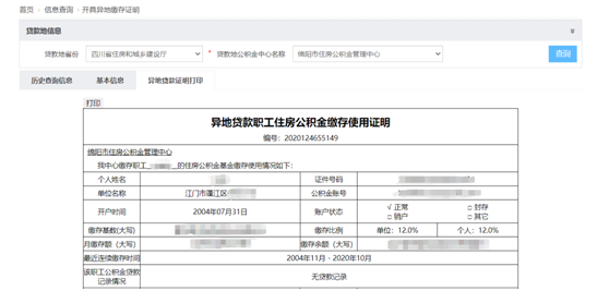 (3)打印界面显示最近一次异地贷款证明的基本信息与异地回执信息,可在显示的缴存使用证明左上方点击“打印”按钮,打印异地贷款证明PDF文件。
