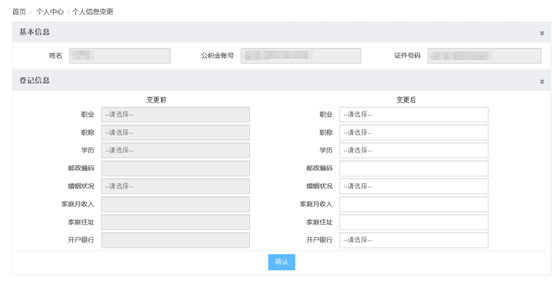 可变更项目:职业、职称、学历、邮政编码、婚姻状况、家庭月收入、家庭住址、家庭住址、开户银行;