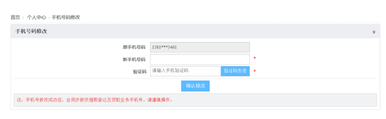 (2)录入新手机号码并获取验证码,点击“确认修改”提交。