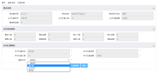 (1)登录广东美高梅博彩网→缴存业务→汇缴申请,选择缴款方式:暂存款。