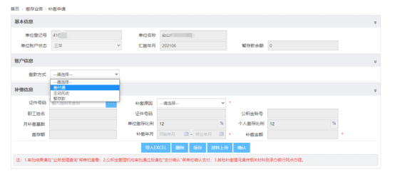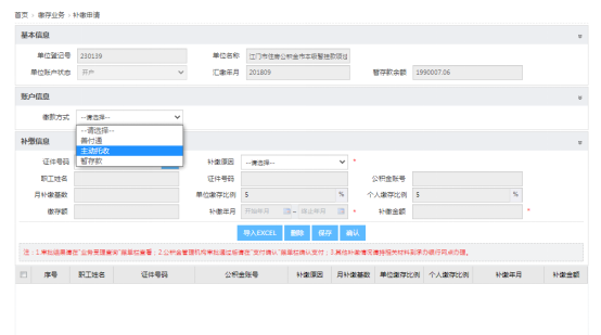 (2)选择需要补缴的员工,选择补缴原因、补缴年月,点击【保存】,选中记录,点击【确认】,提交补缴申请,等待公积金管理机构审批。