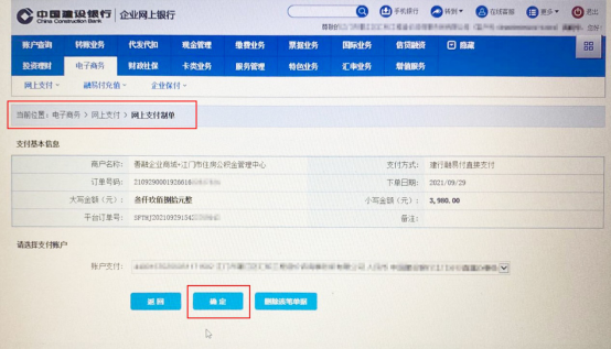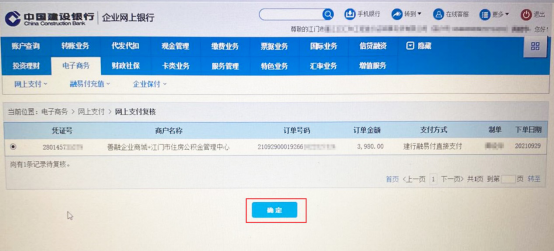 下单成功后,插入制单员网银盾登录企业网银,点击“电子商务—网上支付—网上支付制单”确认订单进行制单,制单完成之后按照系统的提示操作。