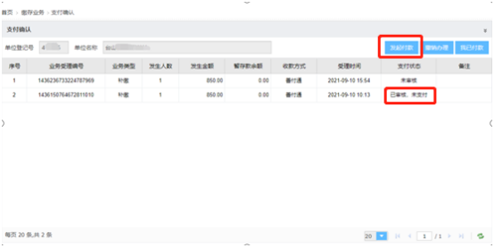 (1)该记录的支付状态显示已审核未支付,选中记录,点击【发起付款】,跳转支付界面。如支付失败、支付成功未跳转、网络故障无法支付、无合适的支付方式等原因,可以回到首页【支付确认】界面,找到对应的业务进行操作。