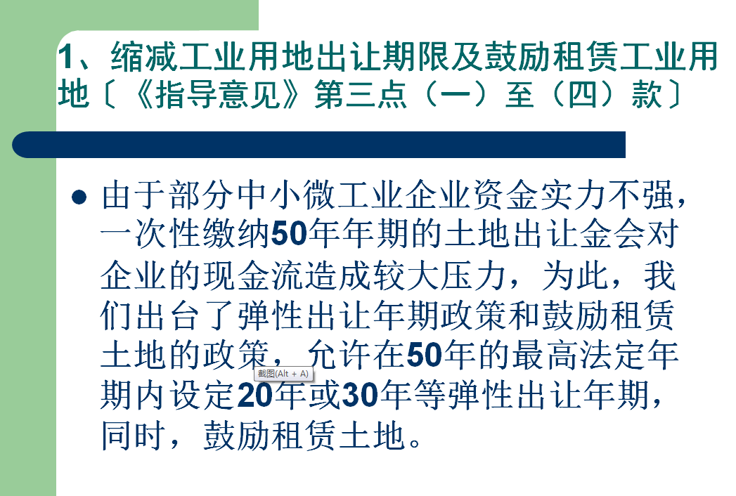(一)全面实行弹性年期出让。新增工业用地出让原则上不超过20年。对于国家、省重大产业项目、战略性新兴产业项目等,经地级以上市人民政府认定后,以认定的出让年期出让,最高不超过50年。