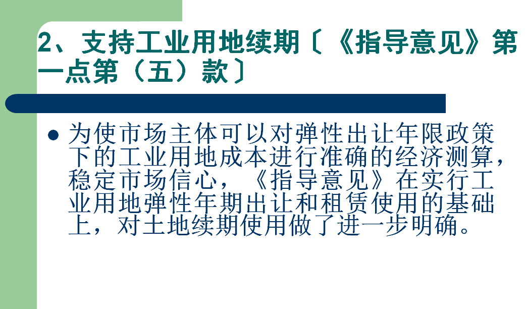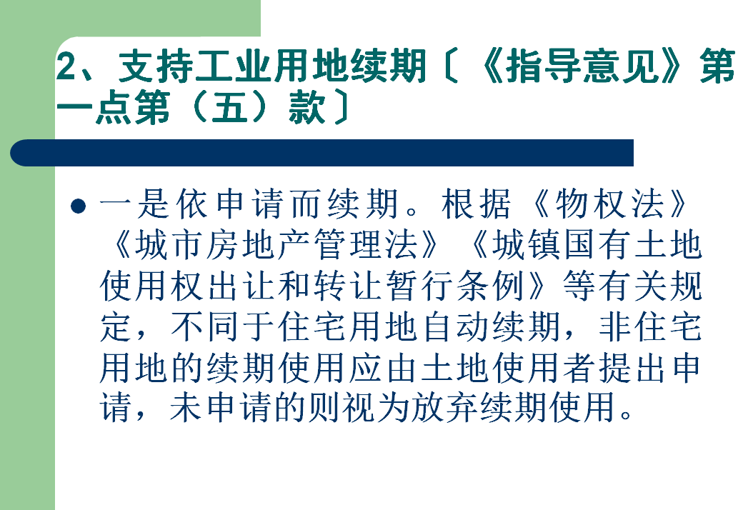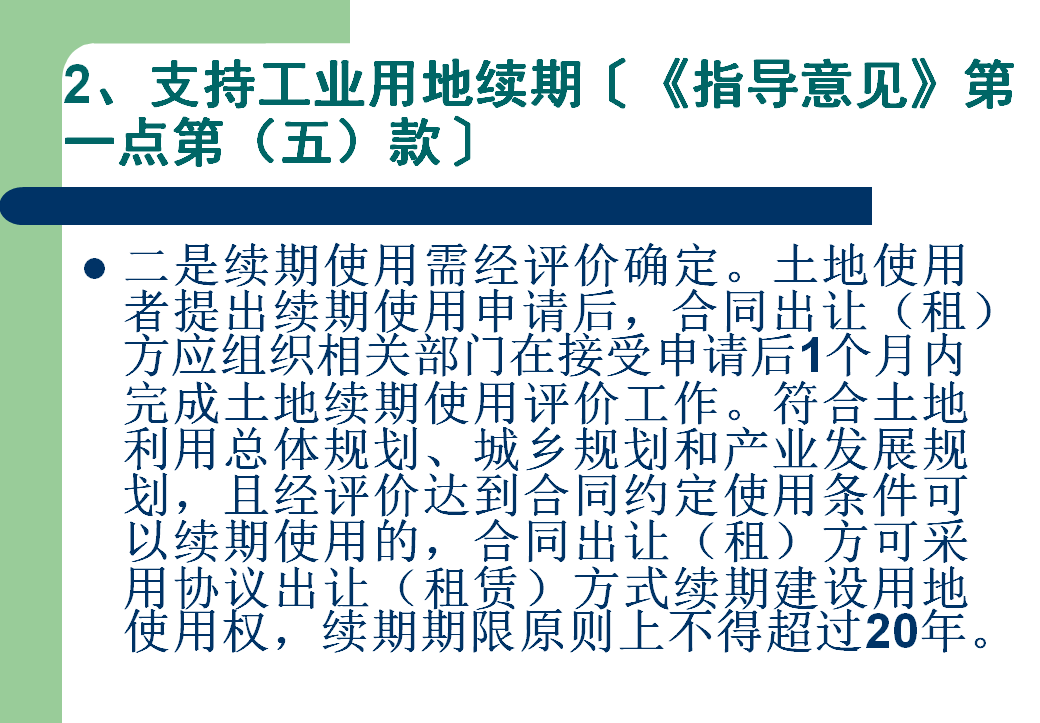 (五)完善土地续期使用制度。工业用地出让或租赁期届满前3个月内,由土地受让方或承租方向出让(租)方提出续期使用申请。出让(租)方应组织相关部门在接受申请后1个月内完成土地续期使用评价工作。符合土地利用总体规划、城乡规划和产业发展规划,且经评价达到合同约定使用条件的,可以协议出让(租赁)方式续期使用。