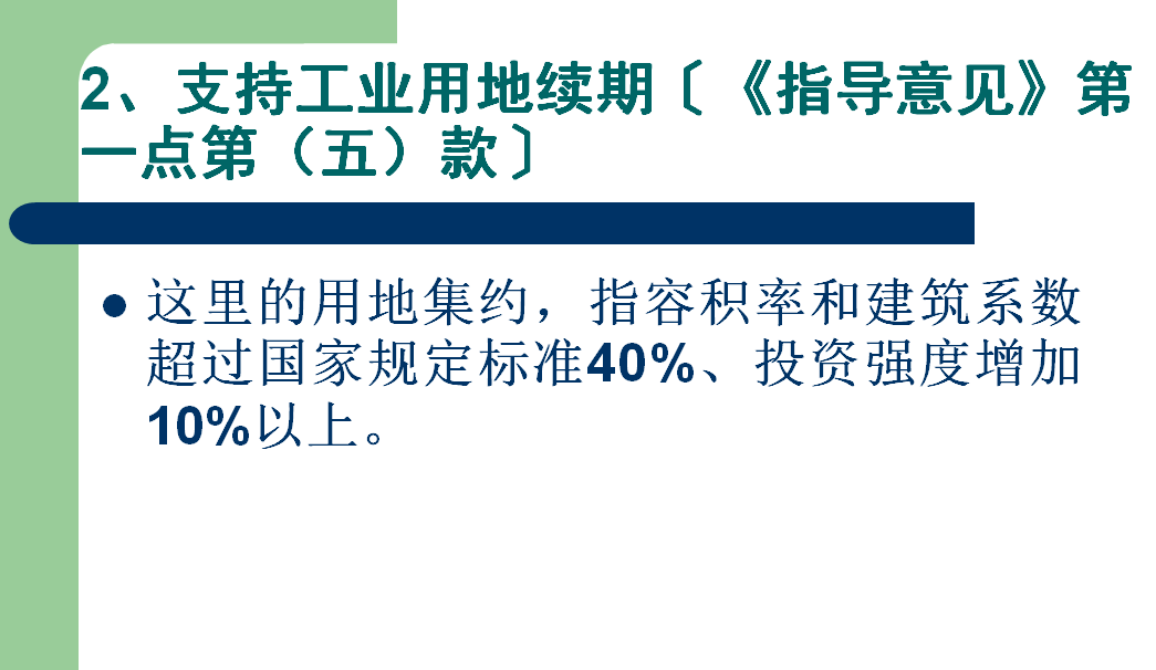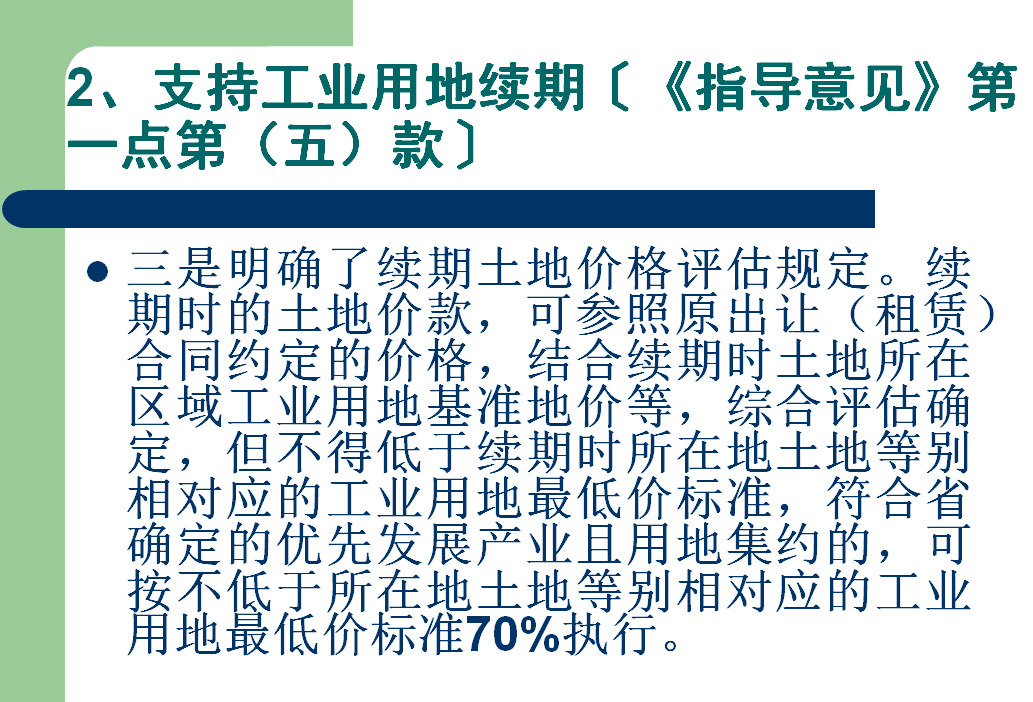 出让(租赁)续期期限原则上不得超过20年。续期时的土地价款,可参照原出让(租赁)合同约定的价格评估确定,但不得低于续期时所在地土地等别相对应的工业用地最低价标准;符合省确定的优先发展产业且用地集约(容积率和建筑系数超过国家规定标准40%、投资强度增加10%以上)的,可按不低于所在地土地等别相对应工业用地最低价标准的70%执行。